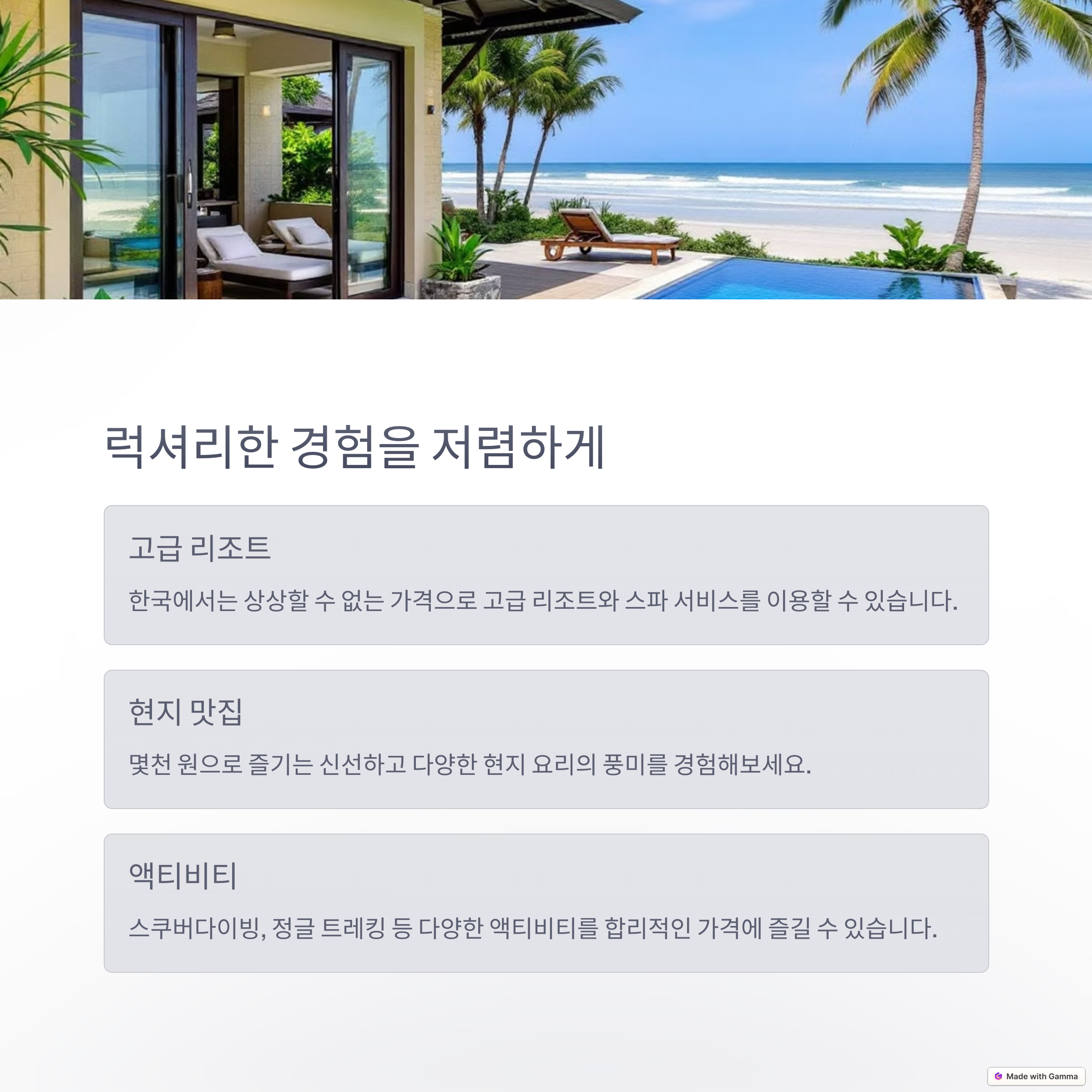 동남아 여행은 **가성비 최고의 선택**입니다. 저렴한 비용으로 럭셔리한 경험을 즐길 수 있으며, 다양한 문화와 맛있는 현지 음식을 접할 수 있습니다.
