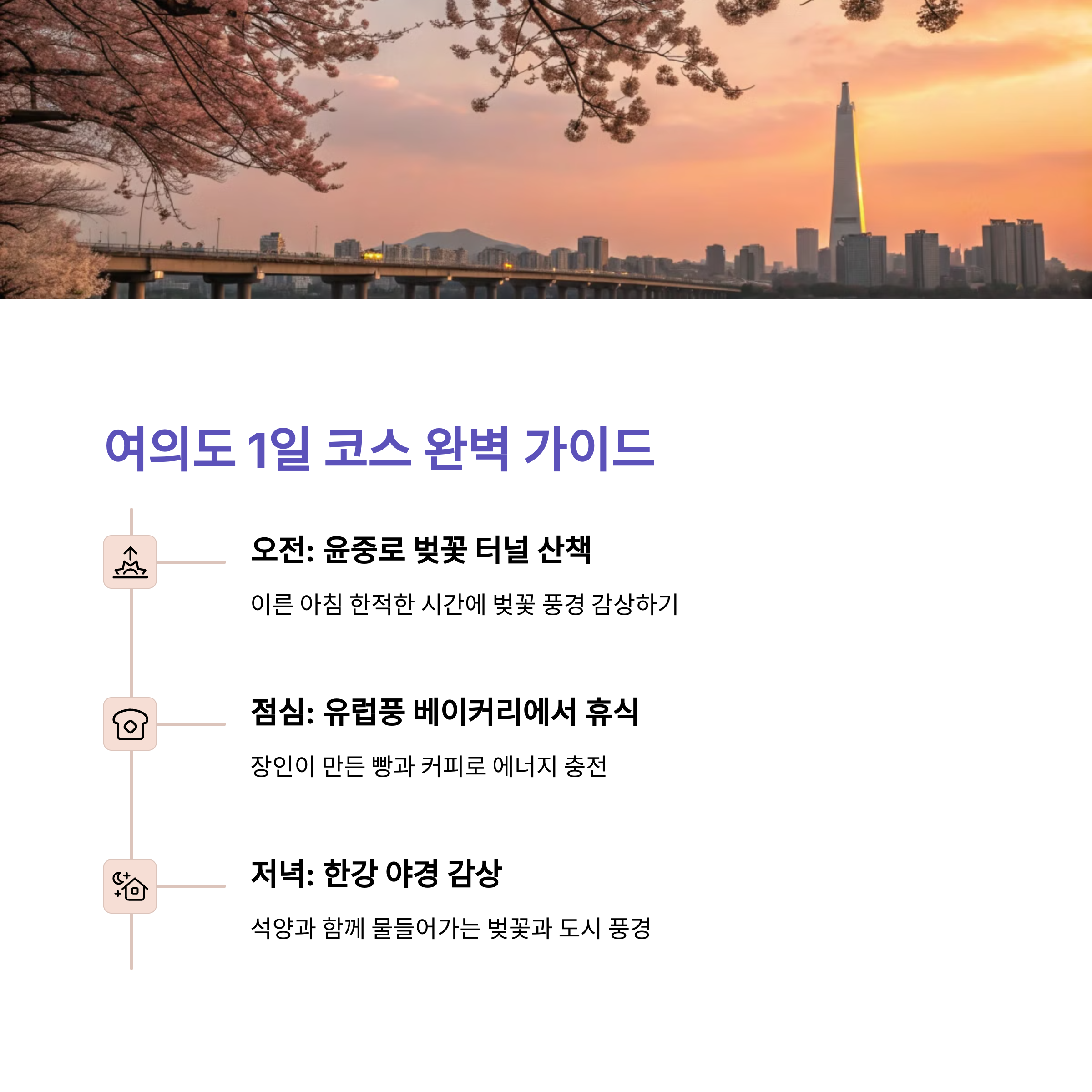 당일치기 여행에서 중요한 건 시간 관리입니다. 벚꽃 절정 시간은 오전~정오 사이이며, 유명 관광지는 혼잡하므로 아침 일찍 출발하는 것이 좋습니다. 혼잡한 점심시간을 피해 브런치나 이른 저녁을 추천드리며, 차량 이용 시엔 주차 여부도 사전 확인이 필수입니다. 이동 중엔 간식이나 음료를 미리 준비해 작은 불편도 줄일 수 있습니다.