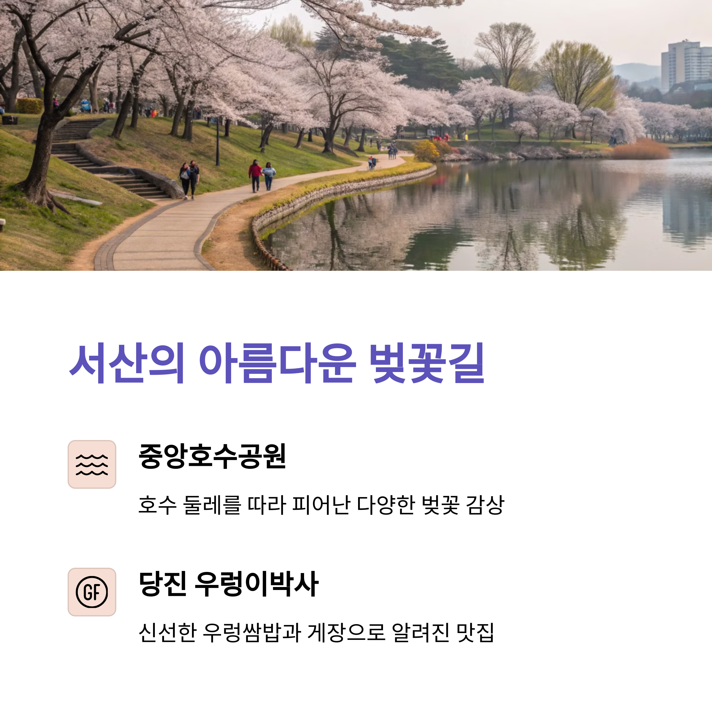 | 진해 여좌천, 경주 보문단지, 전주 덕진공원 | 벚꽃+산책+맛집 원데이 구성 추천 | 통닭거리, 황남빵, 콩나물국밥 등 현지 맛 |