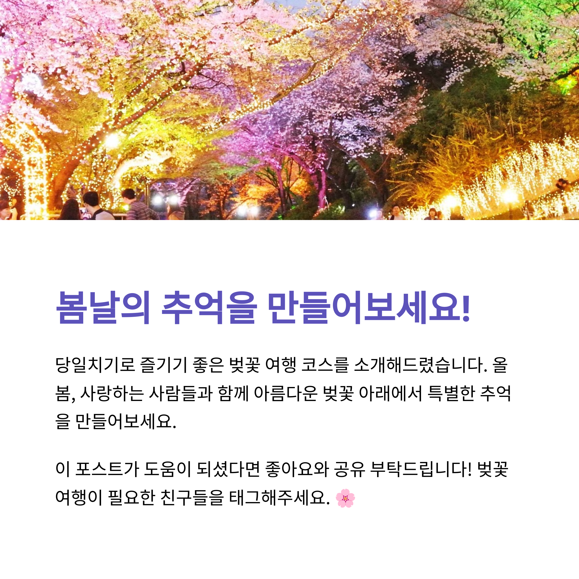 가장 기억에 남는 당일치기 벚꽃 여행지는 어디였나요? 추천하고 싶은 장소나 팁이 있다면 댓글로 공유해주세요. 소소한 정보가 누군가의 봄날을 더욱 특별하게 만들어줄 수 있어요!