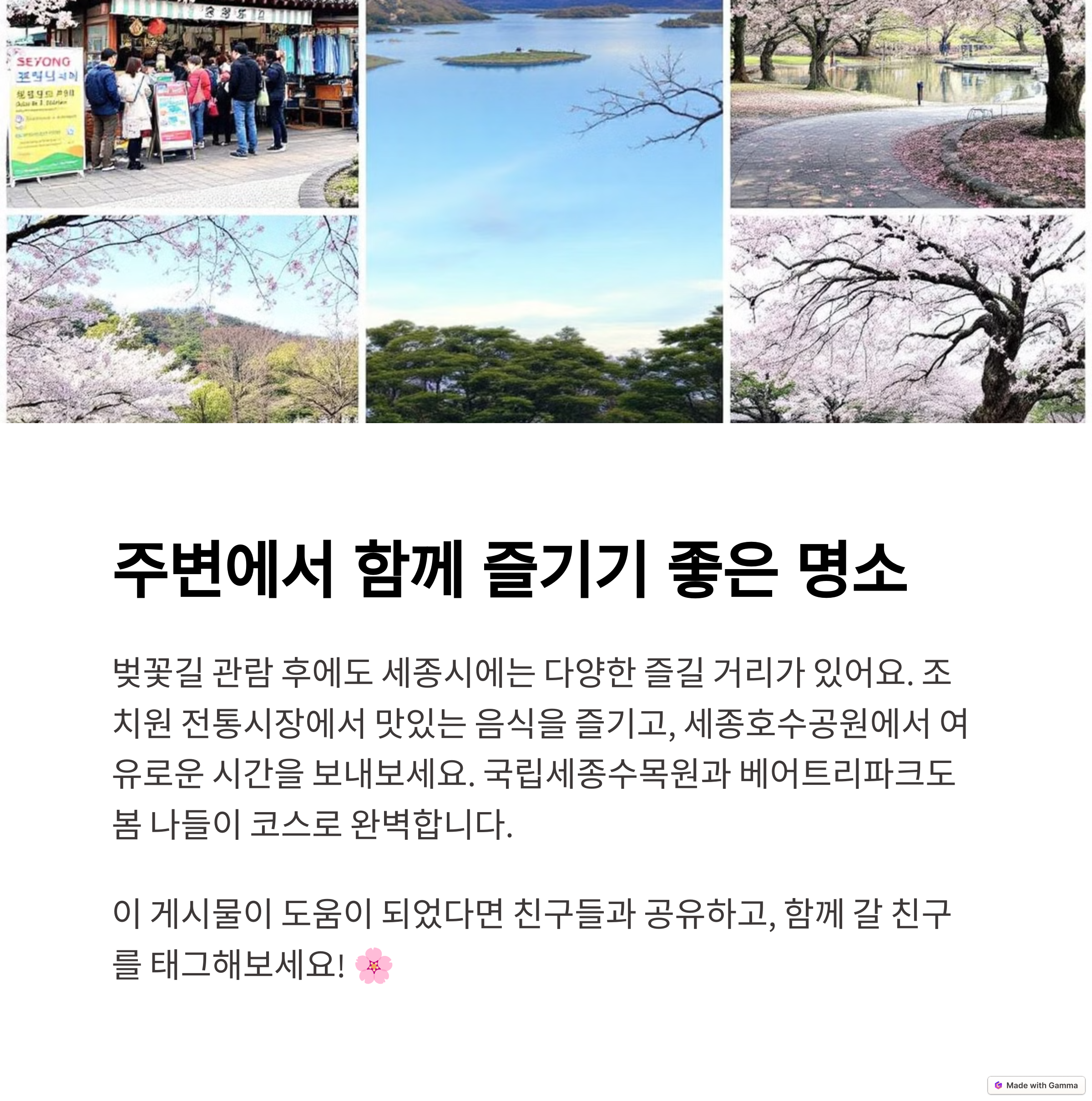 세종 조천 벚꽃길에 방문할 계획이 있으신가요? 여러분만의 벚꽃 명소나 추천 팁이 있다면 댓글로 함께 나눠 주세요! 태그: