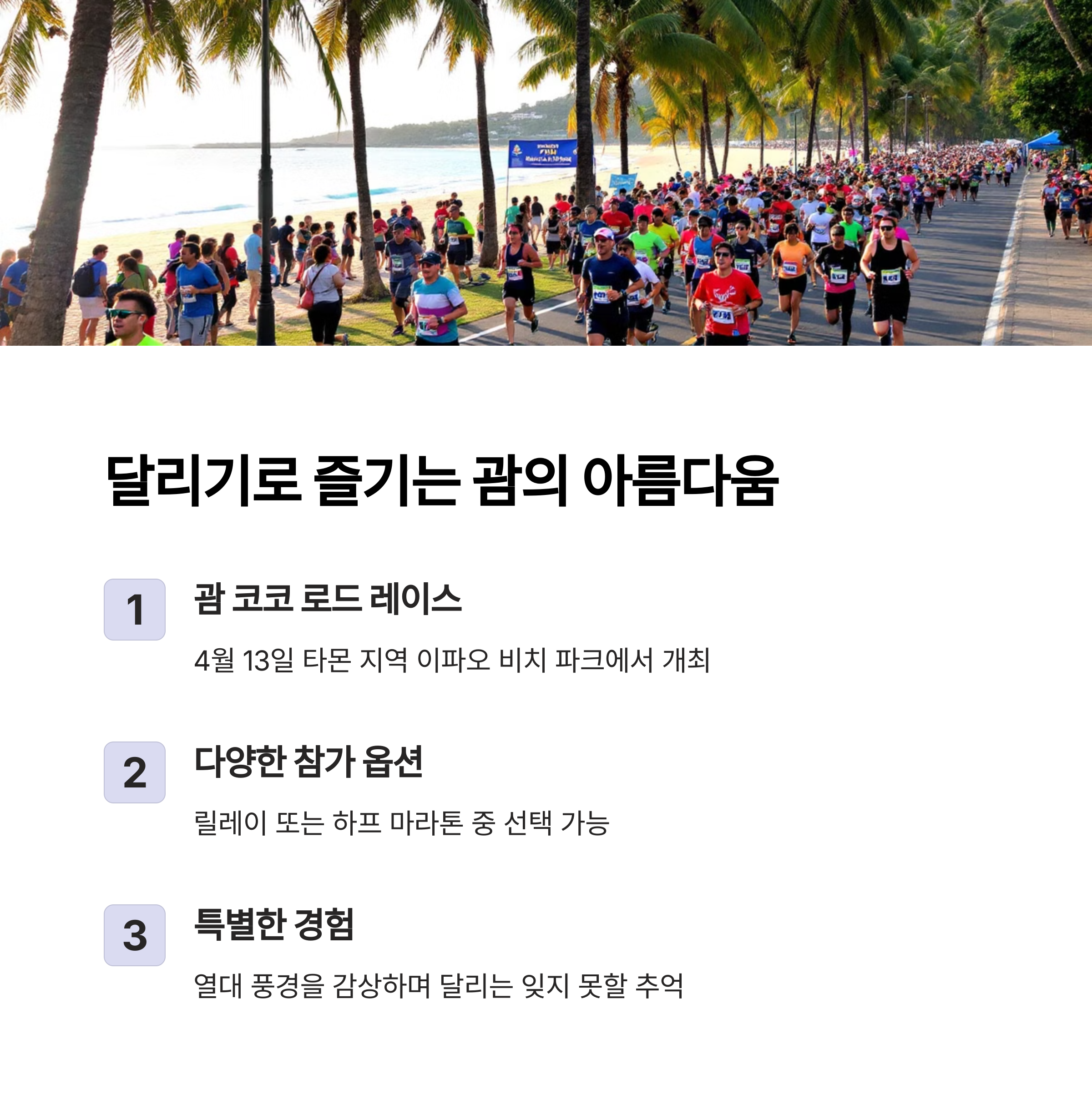 괌을 제대로 즐기기 위해선 여행 팁도 중요합니다. 항공권은 2월에서 3월 초 사이에 미리 예매하면 합리적인 가격에 구입할 수 있고, 대중교통이 부족한 지역 특성상 렌터카를 사전에 예약하는 것이 유리합니다. 또한 4월 13일에는 '괌 코코 로드 레이스'라는 마라톤 행사가 타몬 지역 이파오 비치 파크에서 열려 현지 분위기를 더욱 생생하게 느낄 수 있습니다. 일정이 맞는다면 여행 일정에 포함하는 것도 추천드립니다.