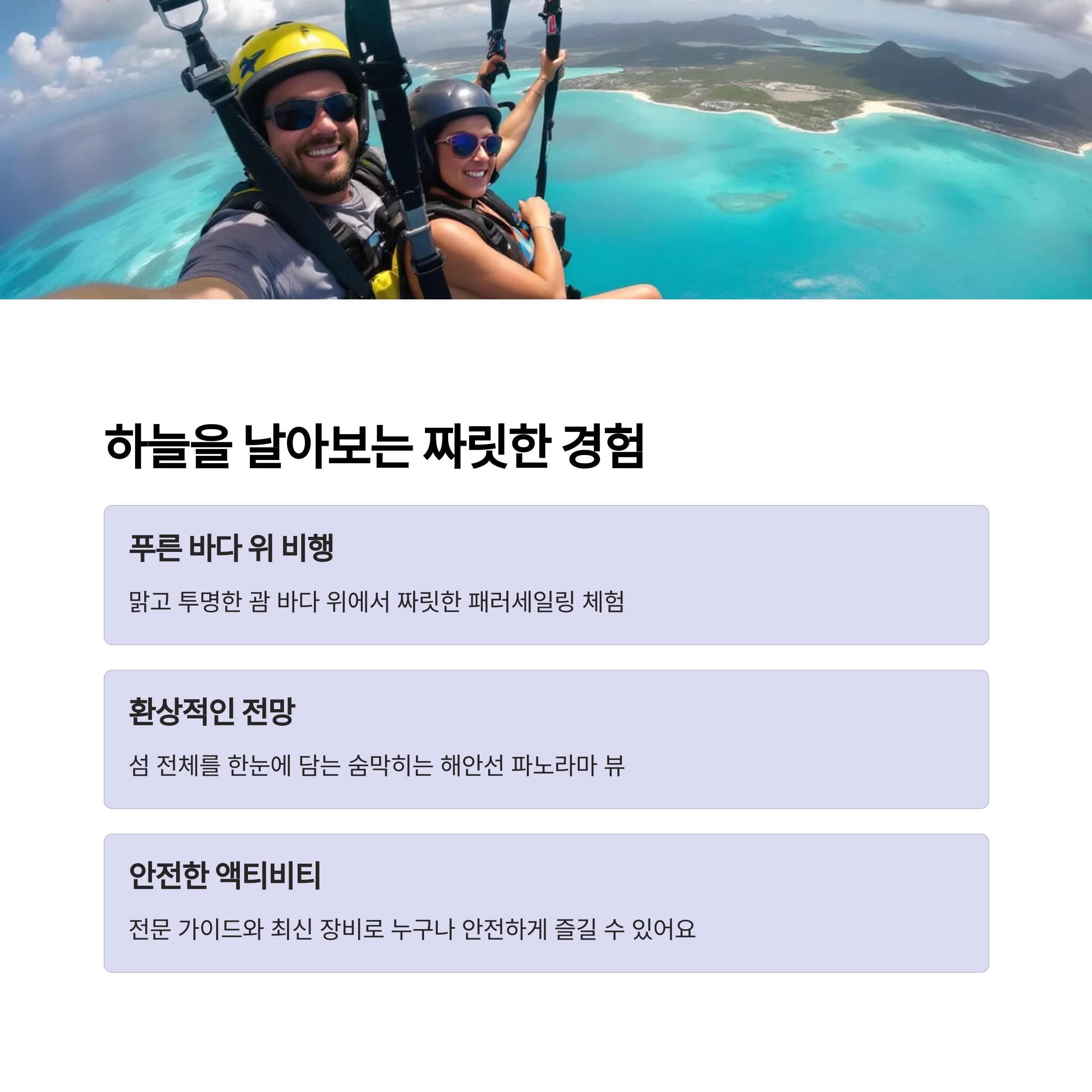 | 해양 액티비티 | 스노클링, 스쿠버다이빙, 패러세일링 등을 즐길 수 있습니다. |