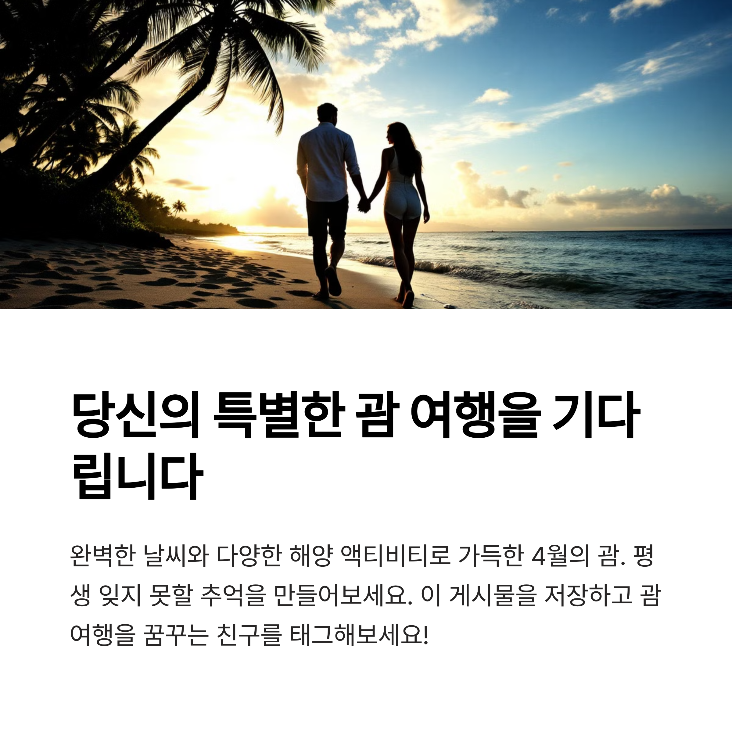 매년 봄이 찾아오면 어디론가 떠나고 싶은 여행의 설렘이 마음을 흔들어 놓습니다. 특히 따사로운 햇살과 푸른 바다가 기다리는 괌은 4월에 가장 빛나는 여행지 중 하나로 손꼽히곤 하죠. 평균 27~30℃의 기온으로 쾌적한 날씨를 자랑하며, 습도가 낮아 장시간 야외 활동에도 부담이 적습니다. 게다가 해양 액티비티의 천국이라 불리는 괌은 남녀노소 누구나 마음껏 즐길 수 있는 다채로운 체험을 제공합니다. 스노클링, 스쿠버다이빙, 패러세일링 등 이름만 들어도 가슴 뛰는 모험들이 여행객을 기다리고 있죠. 이번 포스팅에서는 4월 괌 여행의 매력을 낱낱이 소개해드릴 예정이니, 계획 중이시라면 끝까지 함께해 주세요.
